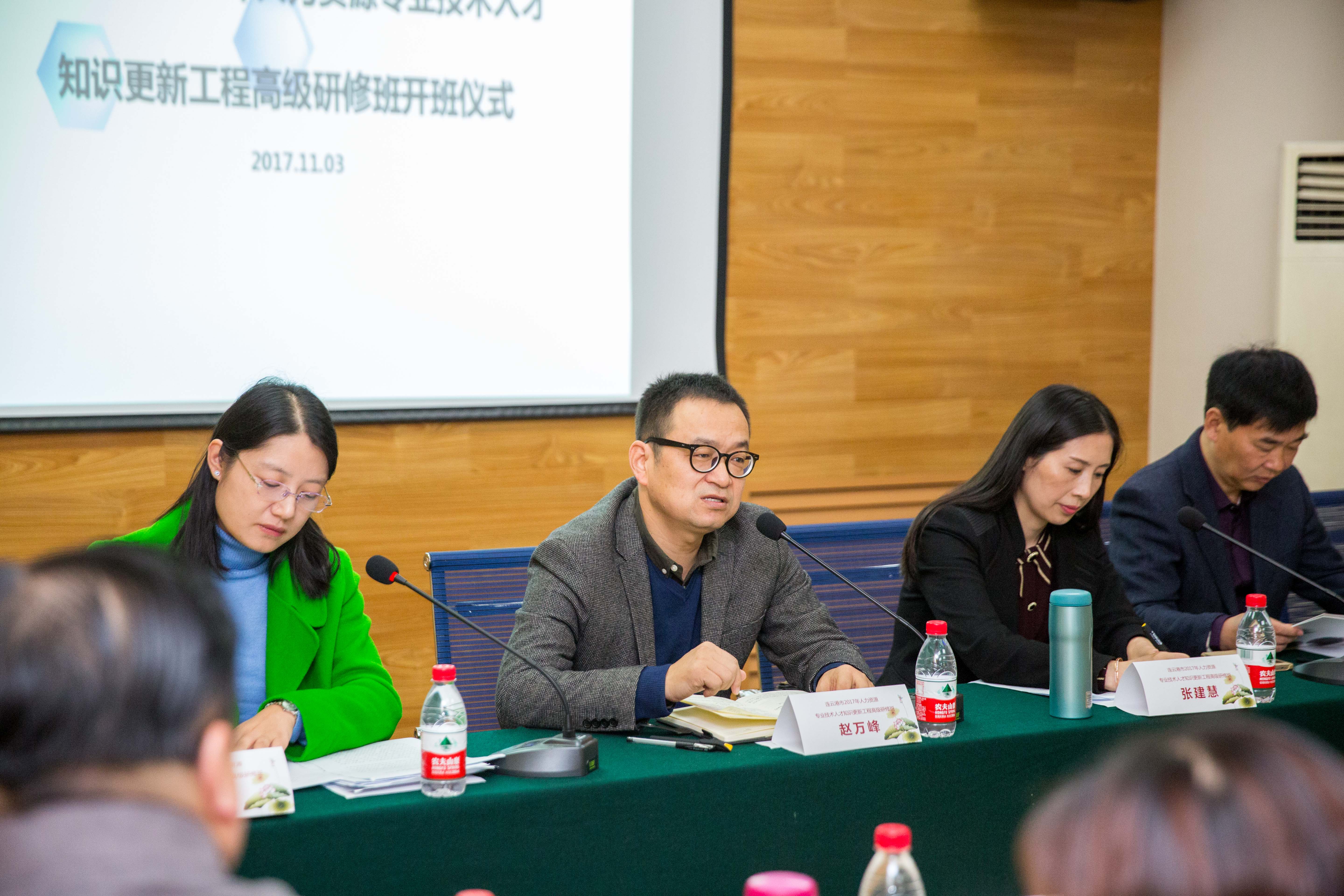 11月3日上午,由连云港市人社局与我校776net必赢官网共同举办的“连云港市2017年人力资源专业技术人才知识更新工程”高级研修班在我校太白校区正式拉开帷幕。连云港市人力资源和社会保障局副局长张建慧,市人才中心主任李海东,776net必赢官网党委书记赵万峰,776net必赢官网副院长张艺昆以及连云港市人社局,连云港市各级政府单位相关领导参加开班仪式。开班仪式由连云港市人社局专技处处长苗泉主持。